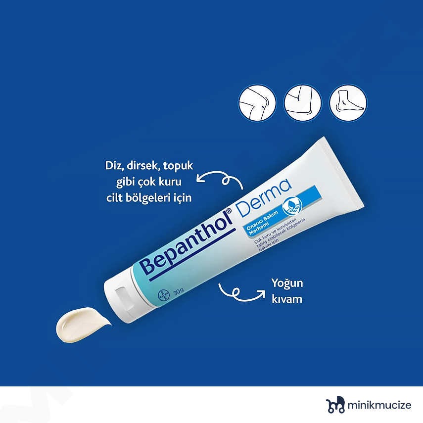 Bepanthol Onarıcı Bakım Merhemi 30 Gr Özellikleri; Çok kuru ve kuruluktan tahriş olabilecek bölgelerin bakımı için Bepanthol Derma Onarıcı Bakım Merhemi cildin ana yapı taşını oluşturan vitaminlerden %5 Provitamin B5 içeriği ile cildi nemlendirir. Cildin sahip olduğu bariyer fonksiyonunu koruyarak cildin yumuşak, pürüzsüz ve esnek tutulmasına yardımcı olur. Parfüm ve renklendirici içermez. Kullanım; Yoğun kıvamlı yapısı ile Bepanthol Derma Onarıcı Bakım Merhemi çok kuru ciltlerde ve kuruluk sebebiyle tahriş olabilecek diz, dirsek, topuk gibi bölgelerde ihtiyaç duydukça gün içerisinde ince bir şekilde uygulayabilirsiniz.